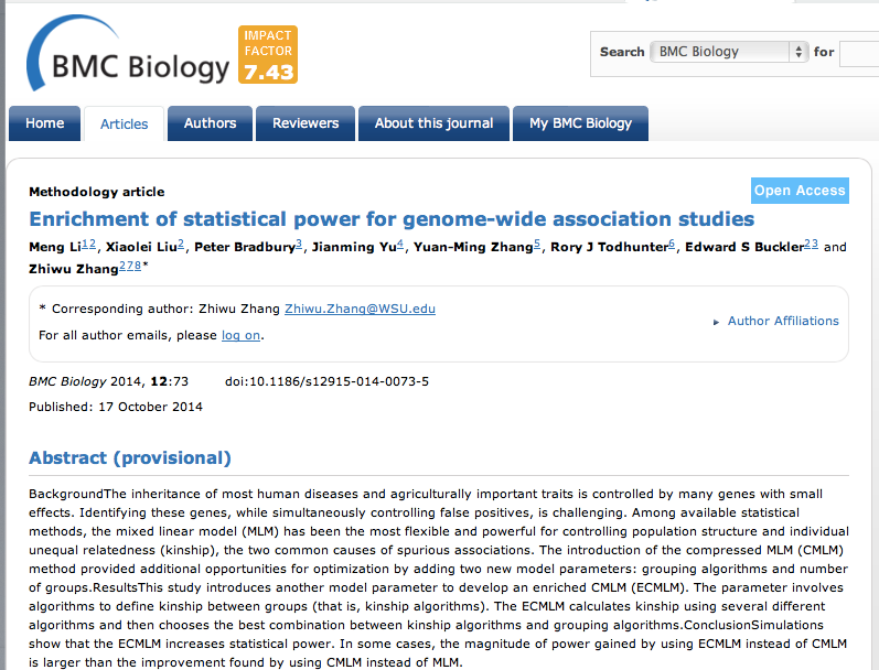 我院青年教师李梦在全基因组关联分析方法的改进方面取得重要进展,以一作者身份发表论文“Enrichment of Statistical Power for Genome-Wide Association Studies”。该论文于10月17日在杂志BMC biology(IF=7.43)在线发表(//www.biomedcentral.com/1741-7007/12/73/abstract)。本文也是作者与美国康奈尔大学Ed Buckler实验室及美国华盛顿州立Zhiwu Zhang合作研究的成果。国产偷拍