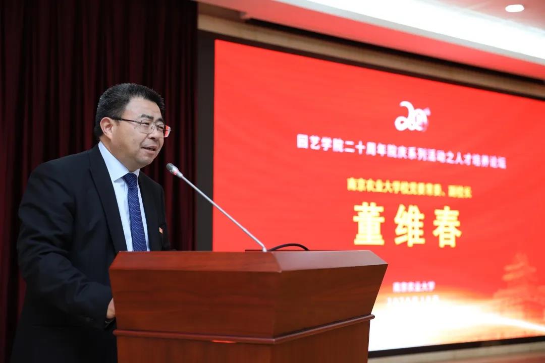 董维春致辞,他代表学校向参加论坛的领导、来宾和校友表示欢迎,他介绍了学校的办学概况及办学历史,园艺学科历史底蕴及发展情况,以“百年中国,百年南农,百年园艺”为主题,带领大家重温“百年园艺”的故事。他指出,历史上我国农业先驱很早便开始向美国、日本和欧洲学习,引进先进理论和技术,根据中国国情进行改良、创新,促进了我国园艺事业的发展。他希望大家在新的起点继续砥砺前行,为国家培养更多园艺新型人才、应用型人才,助力我国园艺事业蓬勃发展。