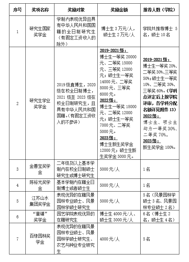 2022-2023学年研究生奖学金参评对象、奖励金额及奖励人数见下表: