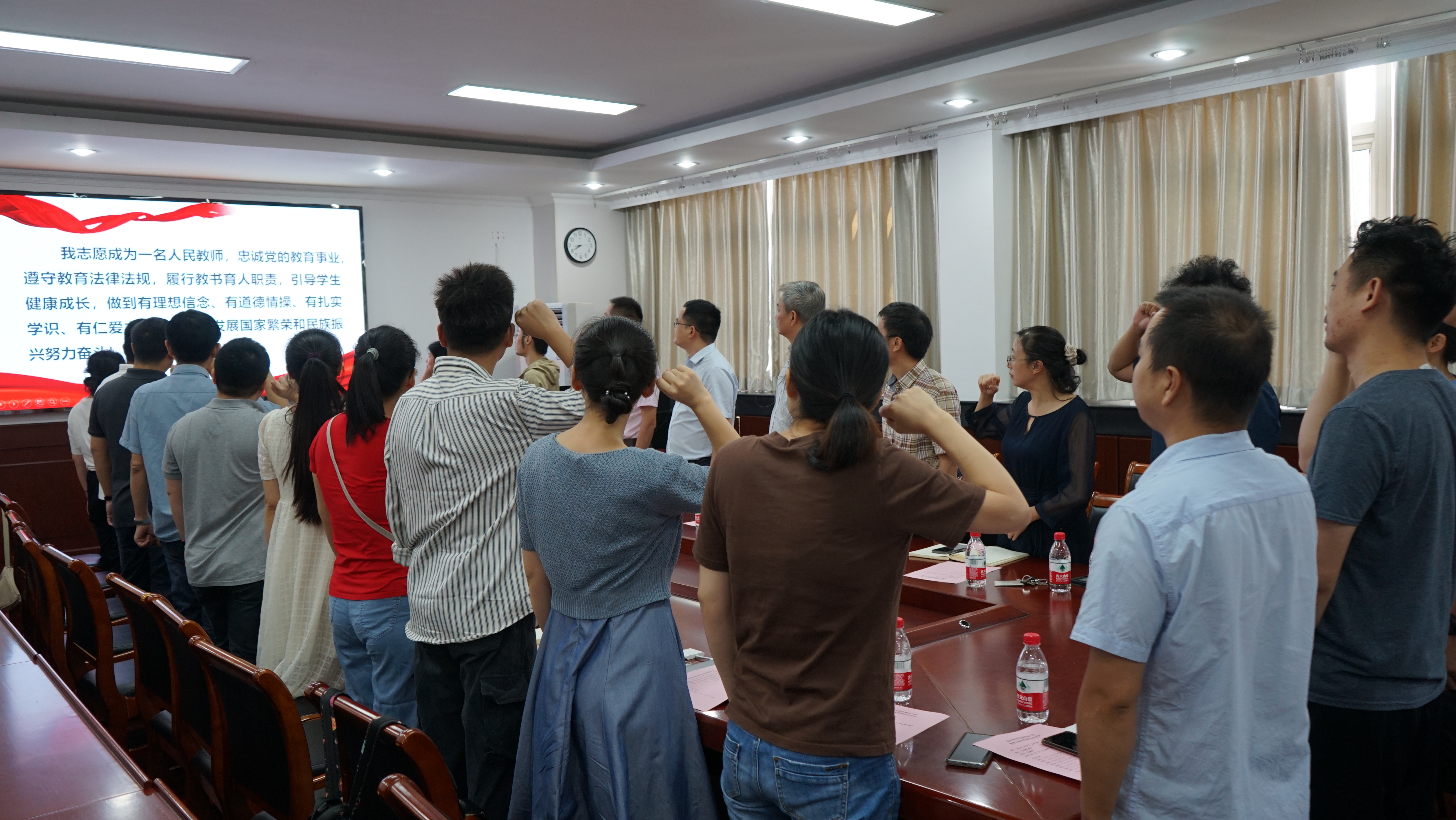 会议开始,院领导、工会主席和先进教师代表为新入职教师佩戴校徽。随后,在陈素梅副院长的带领下,新教师进行了入职宣誓仪式,他们紧握右拳庄严宣誓:忠诚党的教育事业,遵守教育法律法规,履行教书育人职责,引导学生健康成长,做到有理想信念、有道德情操、有扎实学识、有仁爱之心,为教育发展国家繁荣和民族振兴努力奋斗!