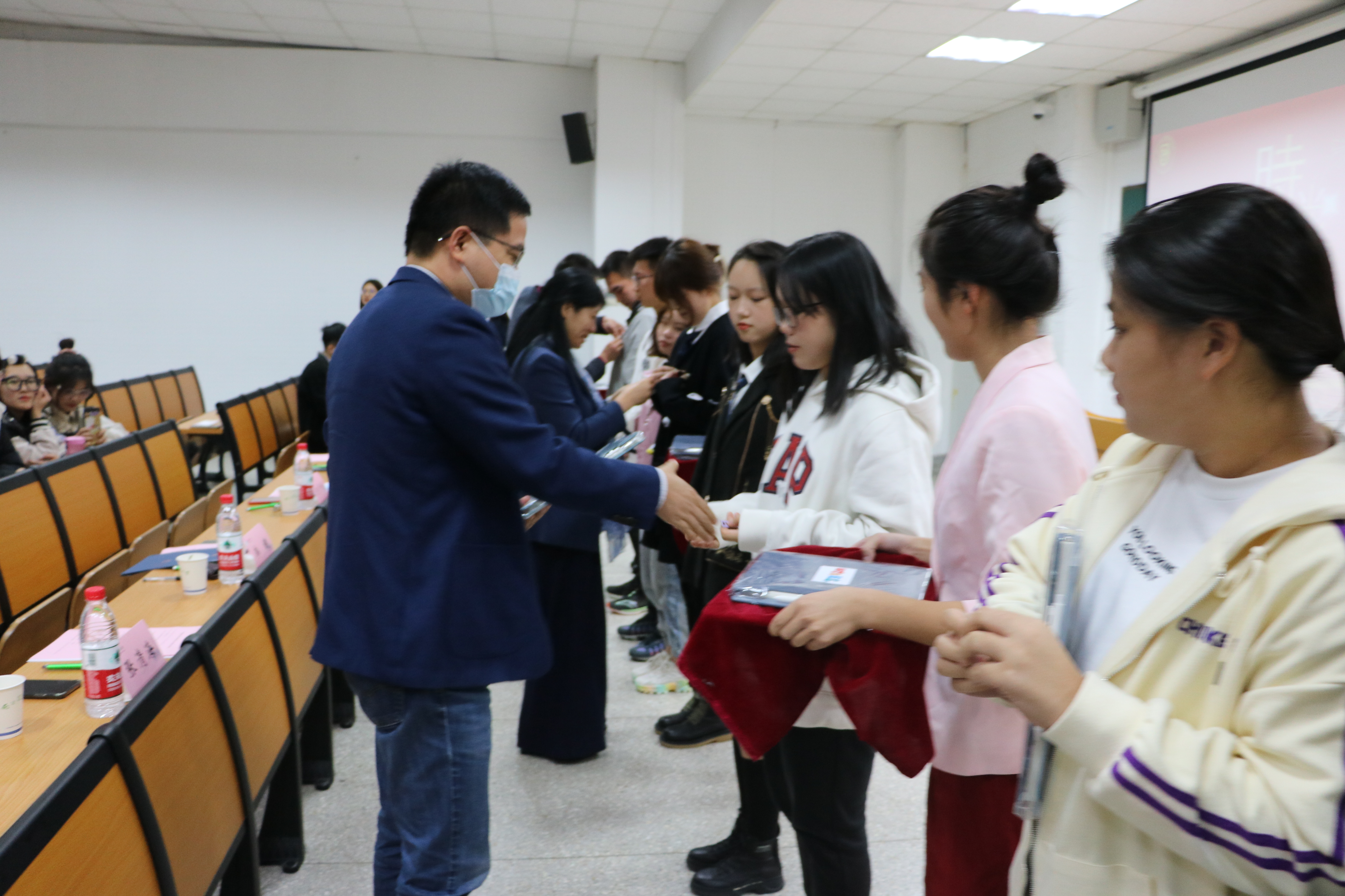 随后,各班新生代表存放班级时光信札,院领导、班主任为新生代表佩戴校徽、赠送班级礼物。