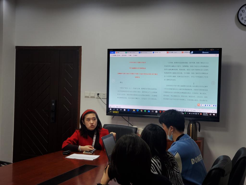 窦靓对本支部建设情况做了简单汇报。过去的一年,支部组织建设与教育管理双融合,使党的创新理论更加入脑入心;理论学习与学术科研双促进,开展了丰富多彩主题教育实践活动;依托学科专业特色开展志愿服务活动,把支部活动开展在科研一线,让学习实践有思想有温度;建立健全支部党员考核机制,提高党员参加活动积极性,做到建品牌与标杆示范双培育;开展支部特色活动,如二十一天学习打卡活动、献礼建党百年主题摄影活动等,提升综合素养。她说,在今后的支部工作开展中,要让更多支部成员带头宣讲,加强大家对于党的理论和方针政策的学习,提升语言表达能力。会上,窦靓带领支部全体党员,通过线上线下学习相结合的方式,学习了《中共中央关于党的百年奋斗重大成就和历史经验的决议》,希望大家能将决议内容和精神记到心里、用到实处。