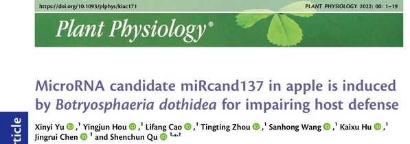 果树生物技术实验室渠慎春教授团队题为“MicroRNA candidate miRcand137 in apple is induced by Botryosphaeria dothideafor impairing host defense”的研究论文,阐明了miRcand137-ERF14苹果轮纹病抗性调控模块,揭示了B. dothidea侵染下感病品种‘富士’苹果和抗性种质湖北海棠miRcand137的表达调控差异,为野生苹果种质的轮纹病抗性机制提供了新的分子基础。