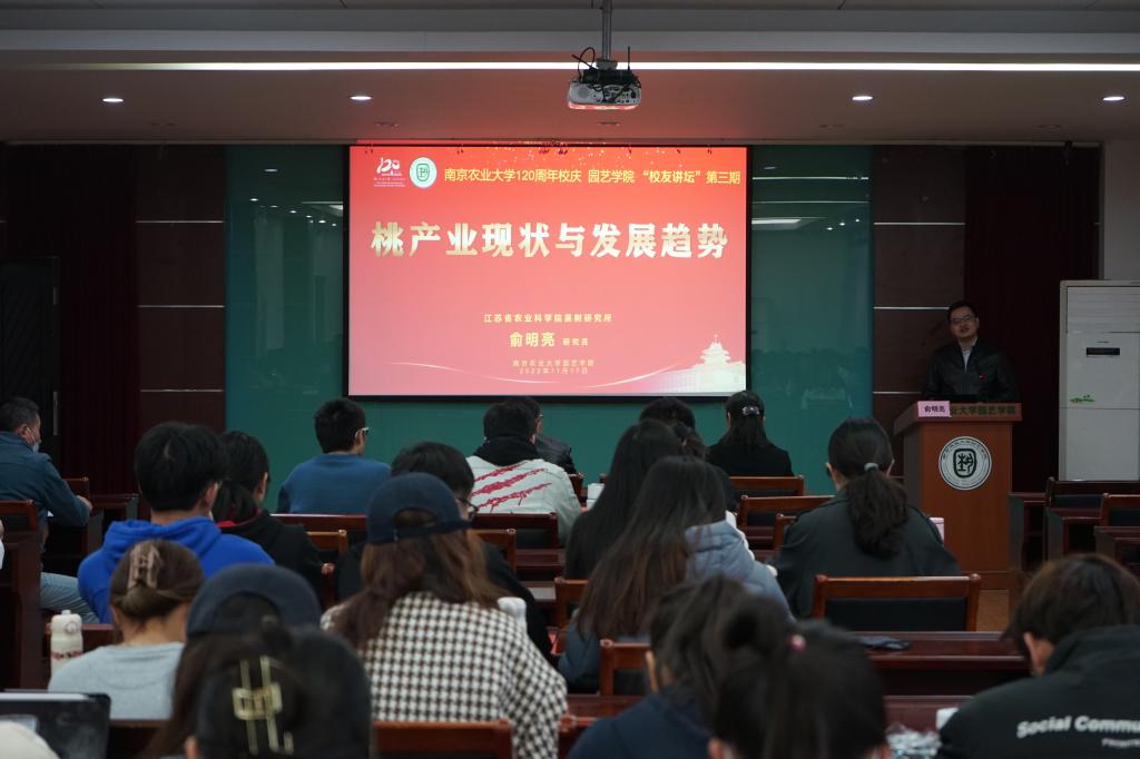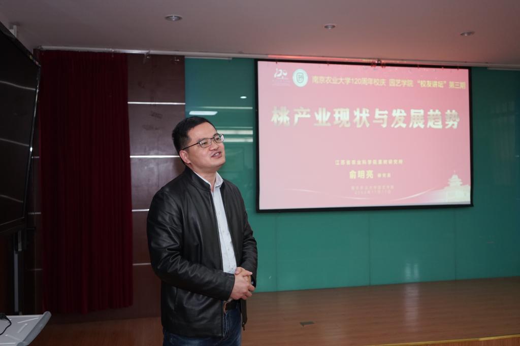 于生科楼B4011成功举办第三期校友讲坛,本期校友讲坛邀请江苏省农业科学院果树研究所俞明亮研究员作题为《桃产业现状与发展趋势》的专题报告。