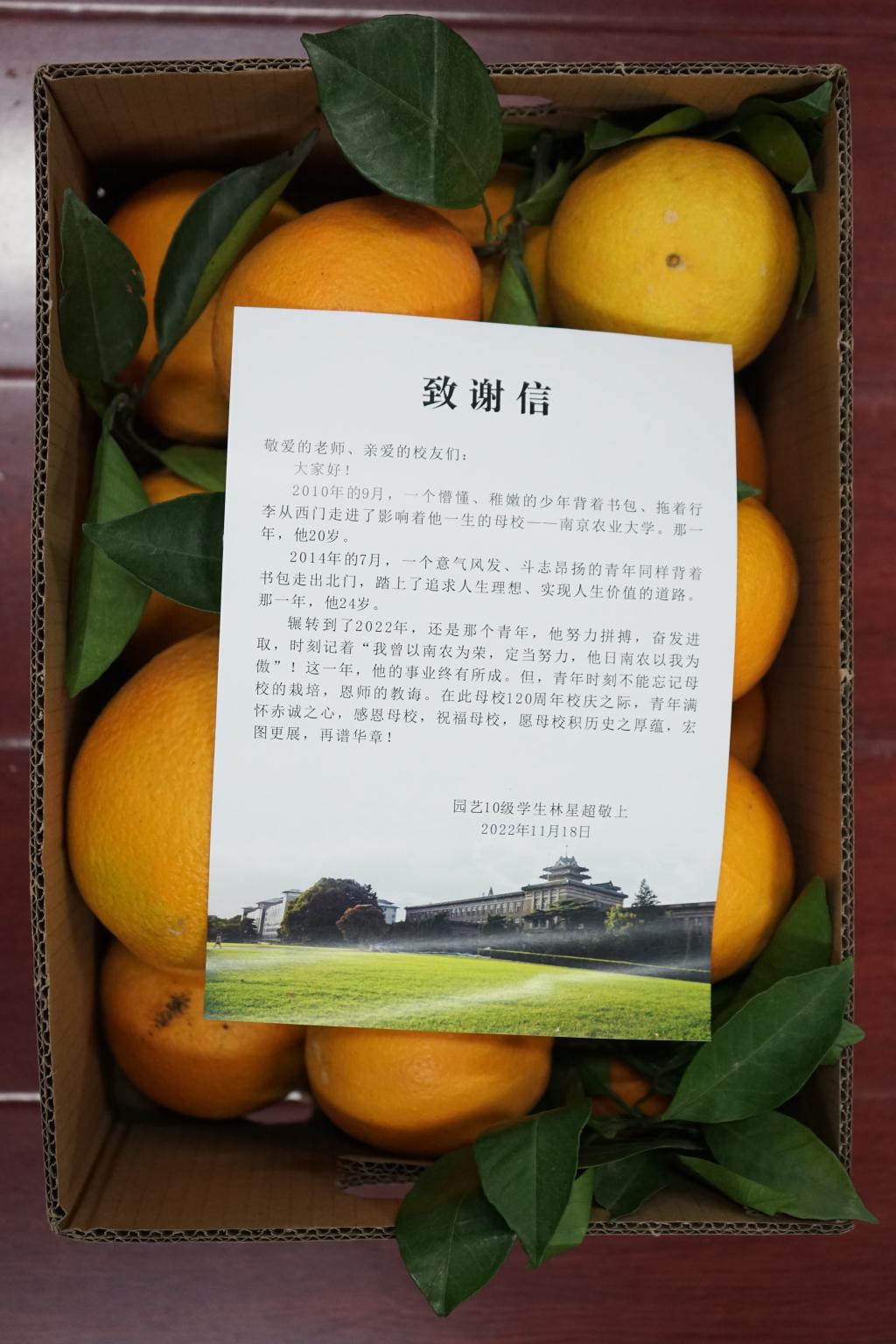 120周年校庆之际,我院园艺专业2010级校友林星超感念母校,感怀师恩,为母校送来“橙”心“橙”意的祝福,向我院捐赠了220箱赣南脐橙,邀学院师生一同尝鲜。