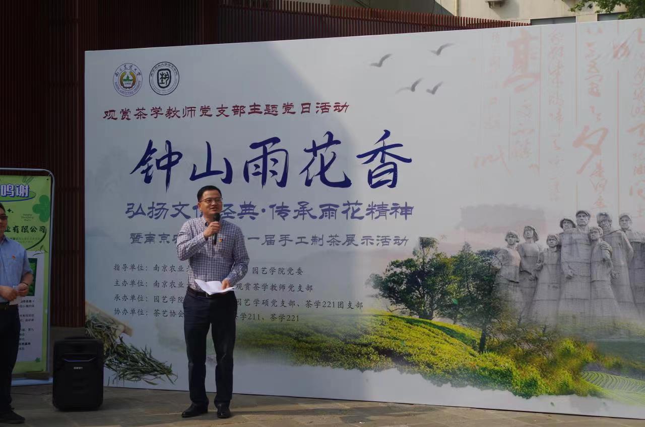 第一届手工制茶展示活动。活动涵盖传统雨花茶制茶技艺展示、手工制茶体验、深加工产品展示和茶文化知识科普竞答四个部分。校党委副书记刘营军出席活动,学工处、校团委、园艺院相关负责同志,江苏省教育厅电化教育馆相关工作人员,观赏茶学教师党支部党员教师、观赏园艺学硕党支部和茶学专业团支部同学参加。