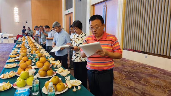 同期举行的第二届“中华好梨”品鉴推介活动,共收到全国171个单位提交的385份样品,涉及113个品种,其中秋月123份、丰水35份、翠冠32份,分别约占32%,9%,8%。评审组由来自21个单位的34位专家组成,根据评审标准,外观品质包括果实大小、果皮色泽、果面光洁度、果形、整齐度等指标,共占40分;内在品质包括肉质细脆及化渣情况、糖酸及香气等风味、汁液多少等指标,共占60分。最后共评选出“中华好梨”39个,金奖77个,银奖112个,优秀组织奖20个。