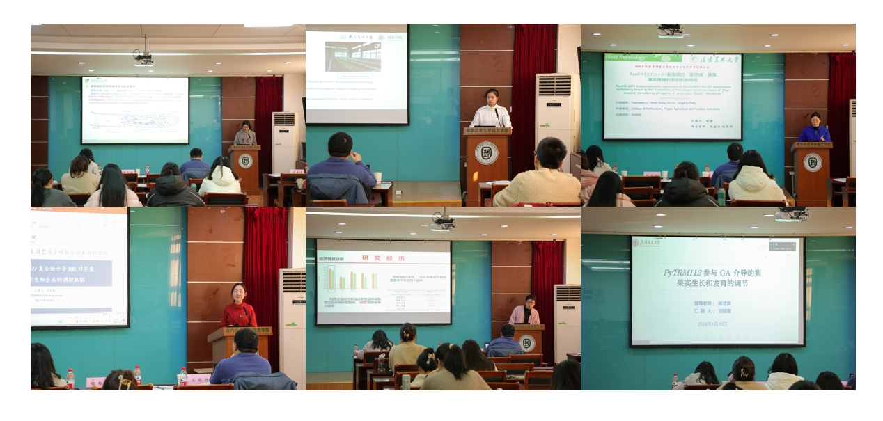 博士王怡、硕士洪平静分别做了题为《黄瓜组蛋白基因家族分析和黄瓜CsCENH3的鉴定》、《葡萄中VvSnRK1-VvSS3应答ABA调控糖代谢研究》的精彩报告。