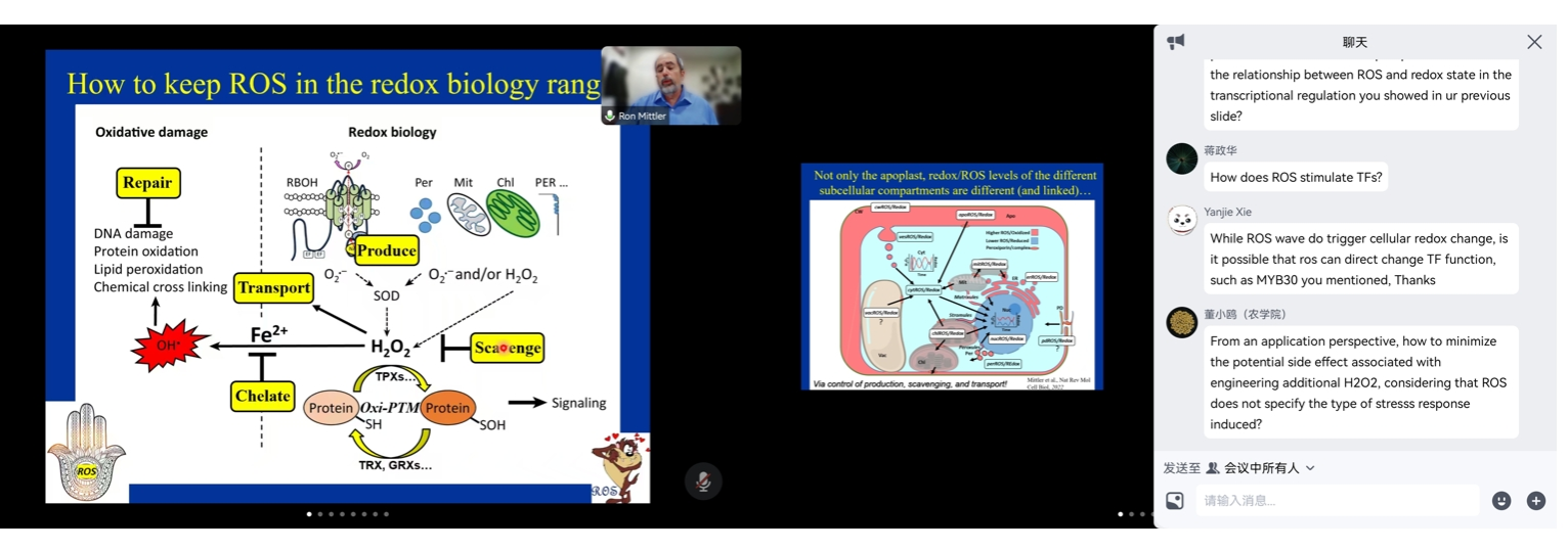 随后,来自美国的密苏里大学的Ron Mittler教授在线上为同学们带来了题为《Reactive oxygen species signalling in plant stress responses》的报告。