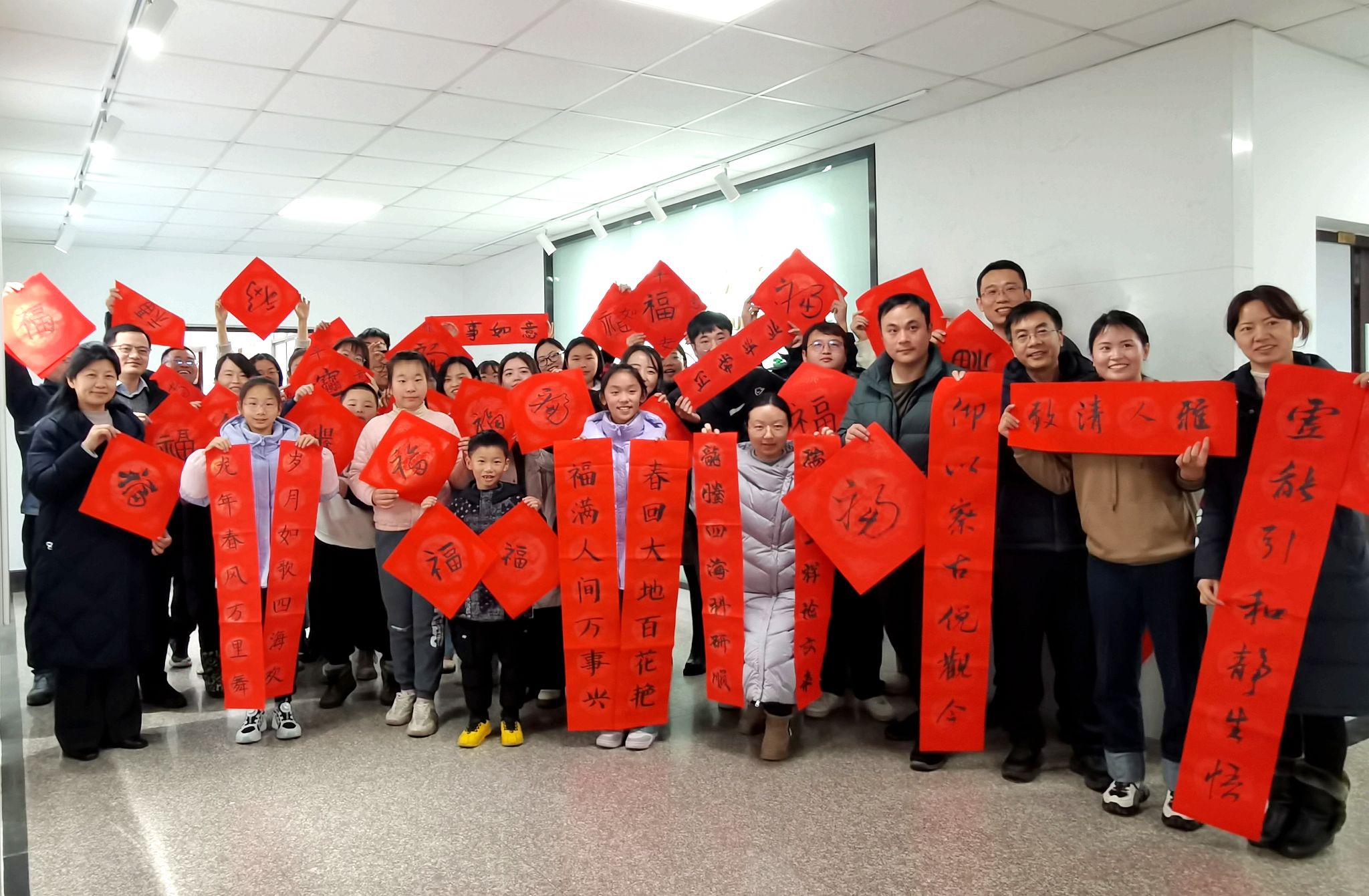 座谈会后,新春书法送福活动继续进行。学院邀请到理学院王环宇老师进行书法文化讲授及春联书写指导。留校师生共同拿起毛笔,铺红纸,沾墨砚,写福字,有手忙脚乱的横七竖八,也有清雅脱俗的一笔一画。红色的纸,黑色的字,你一言我一语的热闹劲,“年”的味道在小小的会议室里不断汇聚,最后在每个人的心间散开。