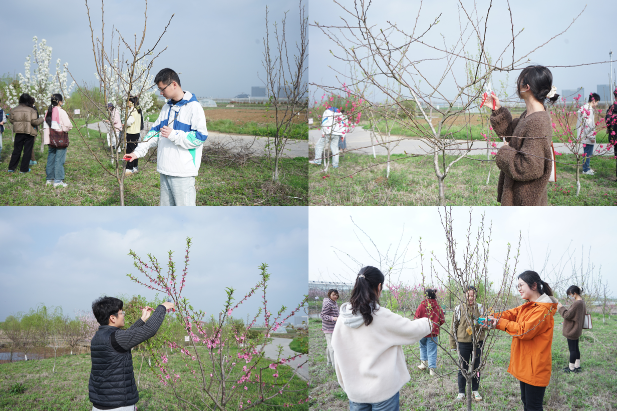 师生党员代表就曾来到此地,种下了“园艺师生专属责任田”,而在今年,这片果园也到了春季修剪的时候,大家同步拿起修枝剪与锯子,运用自己的专业知识对园地内的果树进行修剪“美容”,锻炼了自己专业技能的同时,也让树木的生长更有活力。同学们还就地取材,用宣纸、墨水,结合传统拓印方法,去采集树木的纹理将其拓印在宣纸之上,感受它成长的痕迹,还有同学利用修剪后的枝条和花朵拼凑出一幅幅美丽画卷,定格这一刻的自然之美。