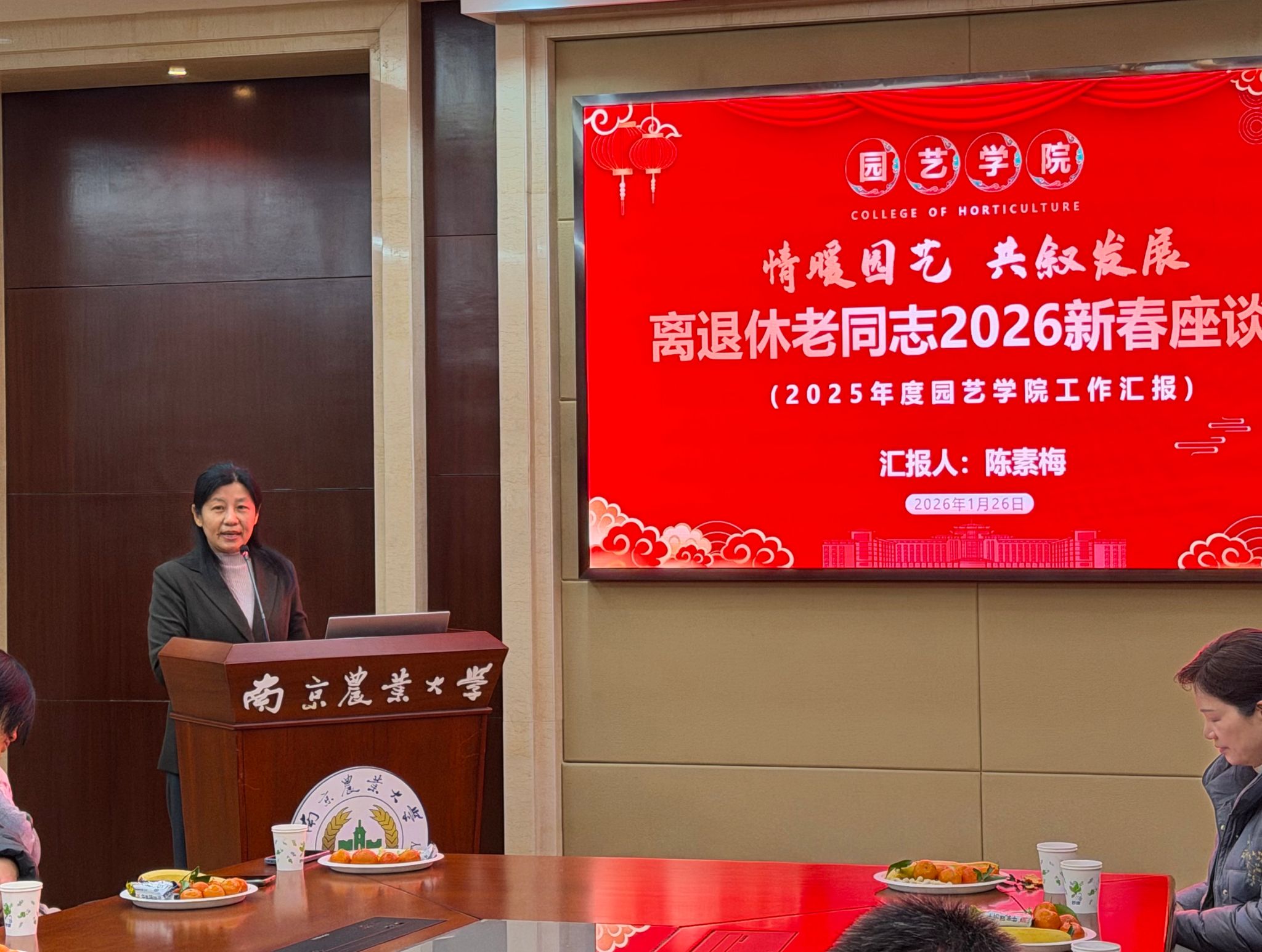 陈素梅向与会老同志详细介绍了学院2025年度的工作进展与主要成绩。她从人才培养、科学研究、社会服务、学科建设、国际交流与合作等方面,全面汇报了一年来学院在高质量发展道路上迈出的坚实步伐和取得的显著成果。陈院长特别指出,这些成绩的取得,离不开老一辈园艺人打下的坚实基础和长期以来的关心支持,她对老同志们致以崇高的敬意和衷心的感谢。