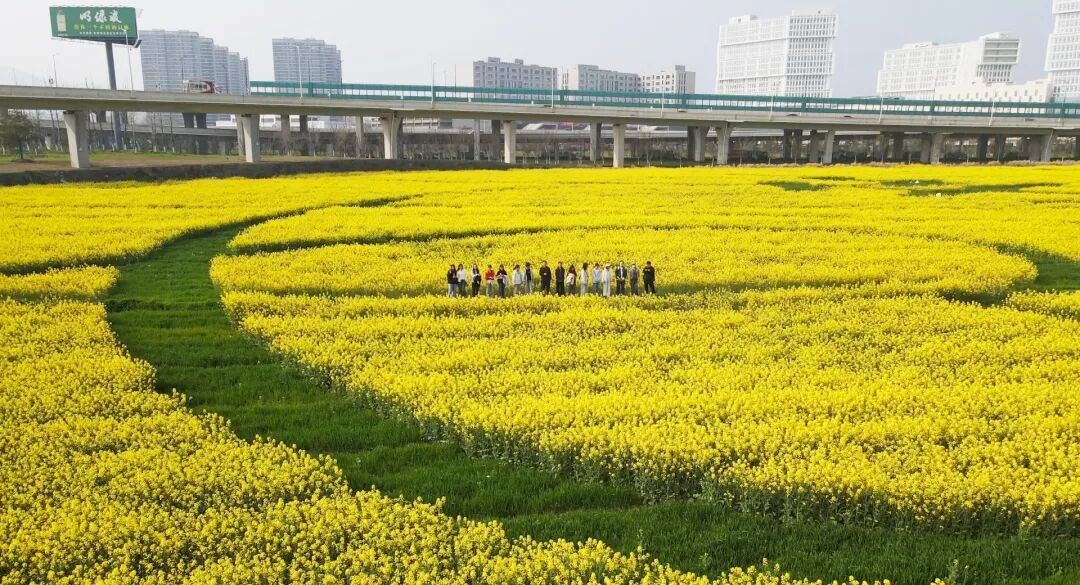 眼下,南京江北新区的一片都市田园春意盎然,连片油菜花竞相绽放,花海与大地艺术景观相映成趣,浦云路大桥等地标融入田园野趣。市民和游人徜徉花间,感受着乡土田园带来的身心疗愈。