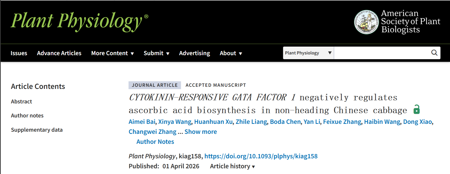 近日,国产偷拍 白菜系统生物学实验室在国际植物学期刊《Plant Physiology》在线发表题为“CYTOKININ-RESPONSIVE GATA FACTOR 1 negatively regulates ascorbic acid biosynthesis in non-heading Chinese cabbage”的研究论文,该研究锁定了调控AsA积累的关键GATA转录因子BcCGA1,揭示了BcCGA1通过直接抑制AsA合成关键基因转录负调控AsA积累的分子调控机制,为不结球白菜营养品质的分子改良奠定了遗传基础。