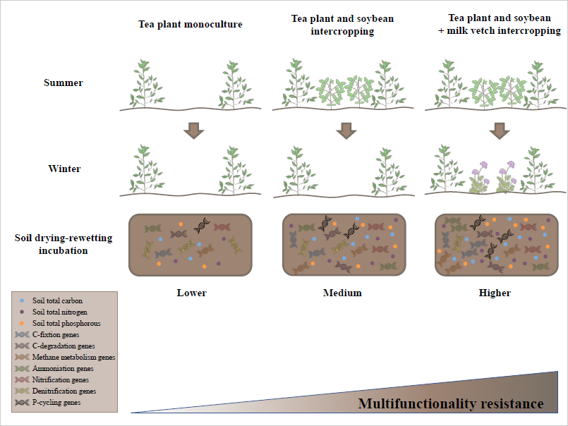 房婉萍教授团队在Science of the Total Environment杂志在线发表了题为Tea plantation intercropping green manure enhances soil functional microbial abundance and multifunctionality resistance to drying-rewetting cycles的研究论文,揭示了茶园间作绿肥对土壤多功能抵抗力的提升效应。该研究为茶园间作绿肥改善茶树鲜叶化学成分含量提供了地下部理论依据,并从土壤功能微生物层次揭示了茶园间作绿肥对土壤多功能抵抗力提升的重要机制,能够为茶园可持续发展提供适宜的多样化种植模式。
