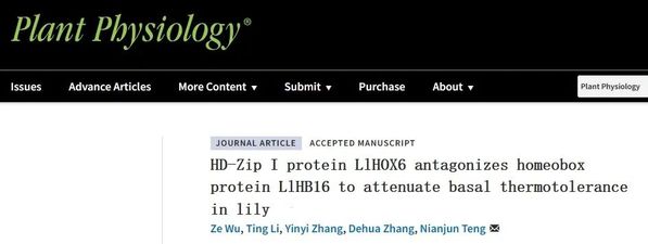 滕年军教授团队在Plant Physiology在线发表了题为“HD-Zip I protein LlHOX6 antagonizes homeobox protein LlHB16 to attenuate basal thermotolerance in lily”的研究论文,揭示了两个HD-Zip I转录因子LlHOX6和LlHB16拮抗调控核心的热响应因子LlHSFA2和LlMBF1c的表达参与百合耐热性建立的机制。