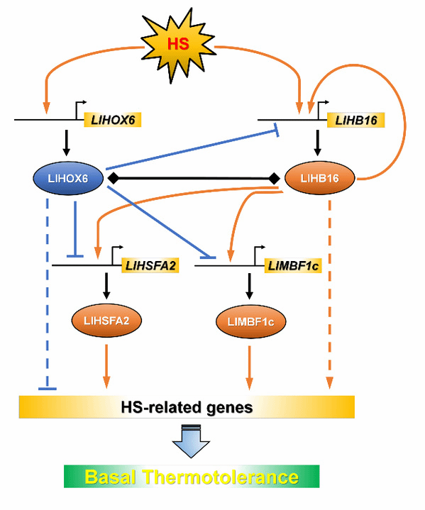 滕年军教授团队近年来在百合耐热性调控机制研究中取得了一系列研究进展,揭示了百合热激转录因子HSFA3通过高温诱导的可变剪接机制精细调控耐热性的机制(Wu et al., 2019, Plant Physiology; 与中国农业大学义鸣放教授合作完成);阐明了百合WRKY39以钙离子依赖的方式与CaM3互作精细调控桥接因子MBF1c的表达正向调控耐热性机制(Ding et al., 2021, Horticulture Research);发现了百合WRKY转录因子WRKY22直接作用于DREB2的上游参与耐热性的调控(Wu et al., 2022, Horticulture Research);在百合中鉴定了MYB305-C3H18-WRKY33功能模块调控耐热性(Wu et al., 2023, Molecular Horticulture);鉴定了一个膜结合的NAC转录因子LlNAC014,其响应高温转移至核内,激活DREB2-HSFA3模块正向调控耐热性(Wu et al., 2023, Journal of Experimental Botany);该篇论文进一步发现百合另一个HD-Zip I成员HOX6与HB16互作,拮抗地调控百合耐热性。基于上述系统的研究,该团队构建了比较完善的百合响应高温胁迫的分子调控网络,将为百合乃至其他农作物耐热性改良提供了重要理论基础。