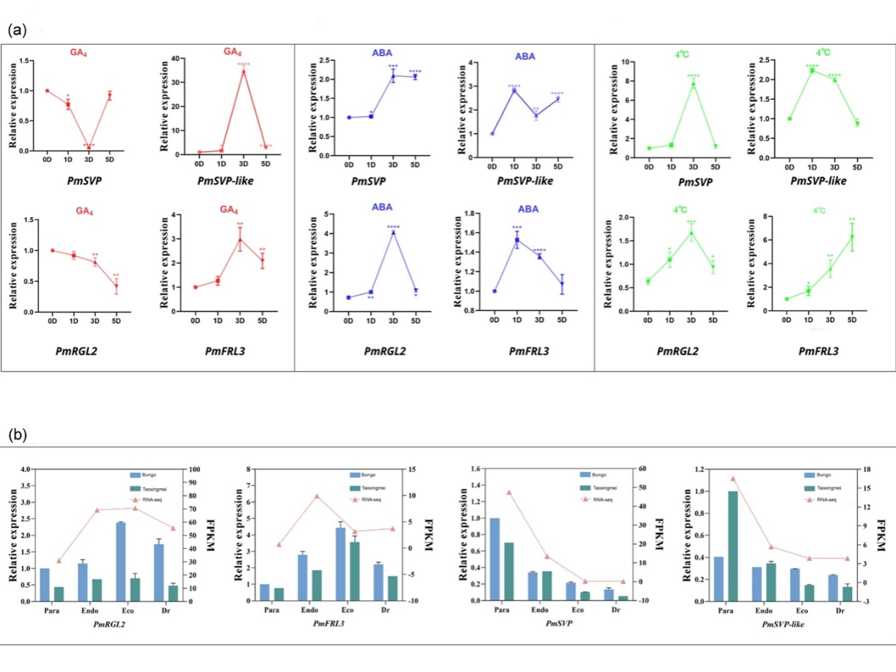 为了进一步验证PmSVP和PmSVP-like的功能,作者进行了拟南芥遗传转化实验。转基因表型观察表明,OE-PmSVP-like的转基因植株比野生型开花更早,而OE-PmSVP转基因植株表现出晚花表型。激素在开花过程中起着关键作用,OE-PmSVP-like中的GA含量高于OE-PmSVP,但有趣的是,ABA的含量恰恰相反。这与以前的研究一致,在打破休眠和开花机制中,ABA的功能是维持休眠和抑制开花,而GA是打破休眠并促进开花(Wen et al. 2016; Zhuang et al. 2013)。